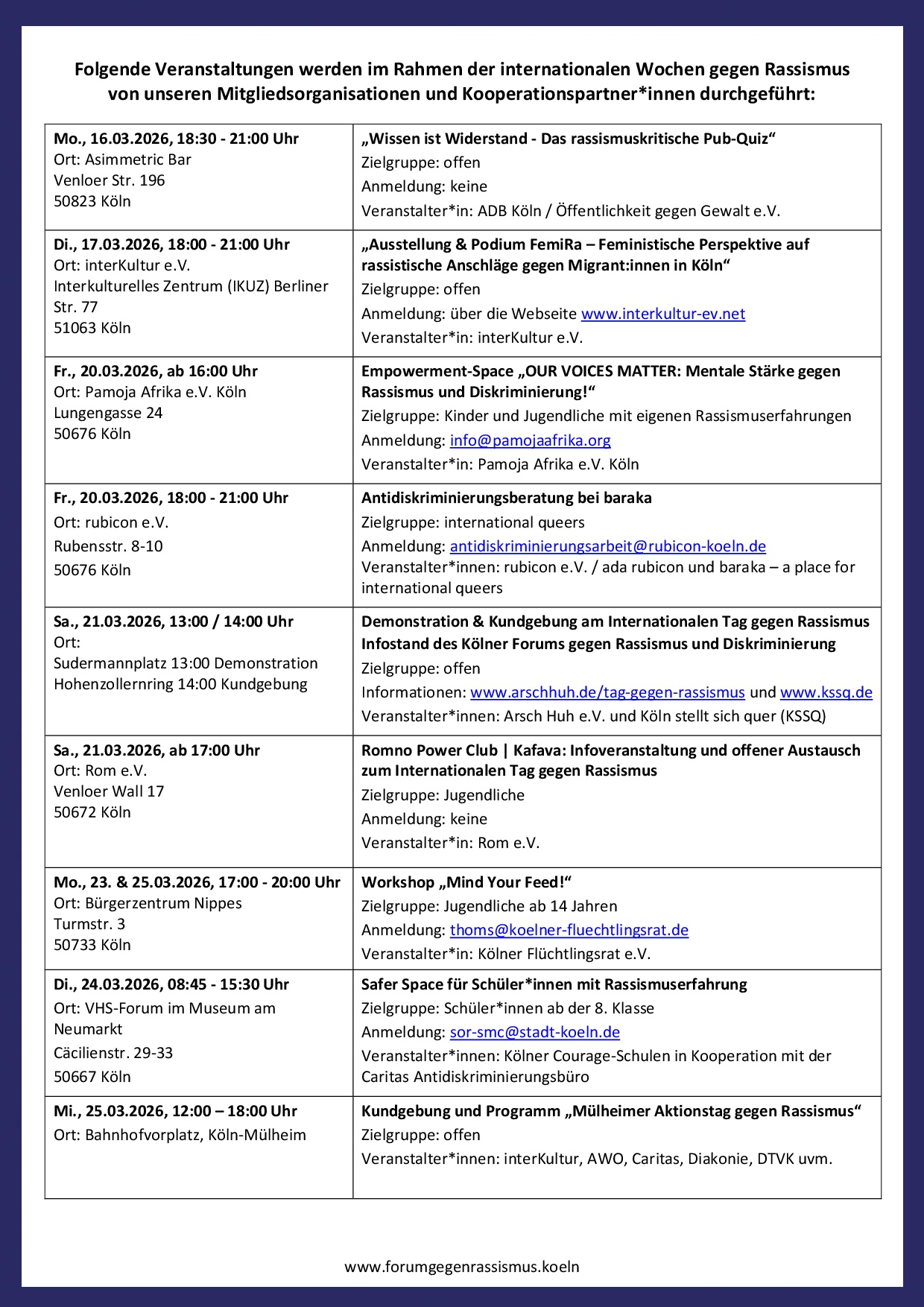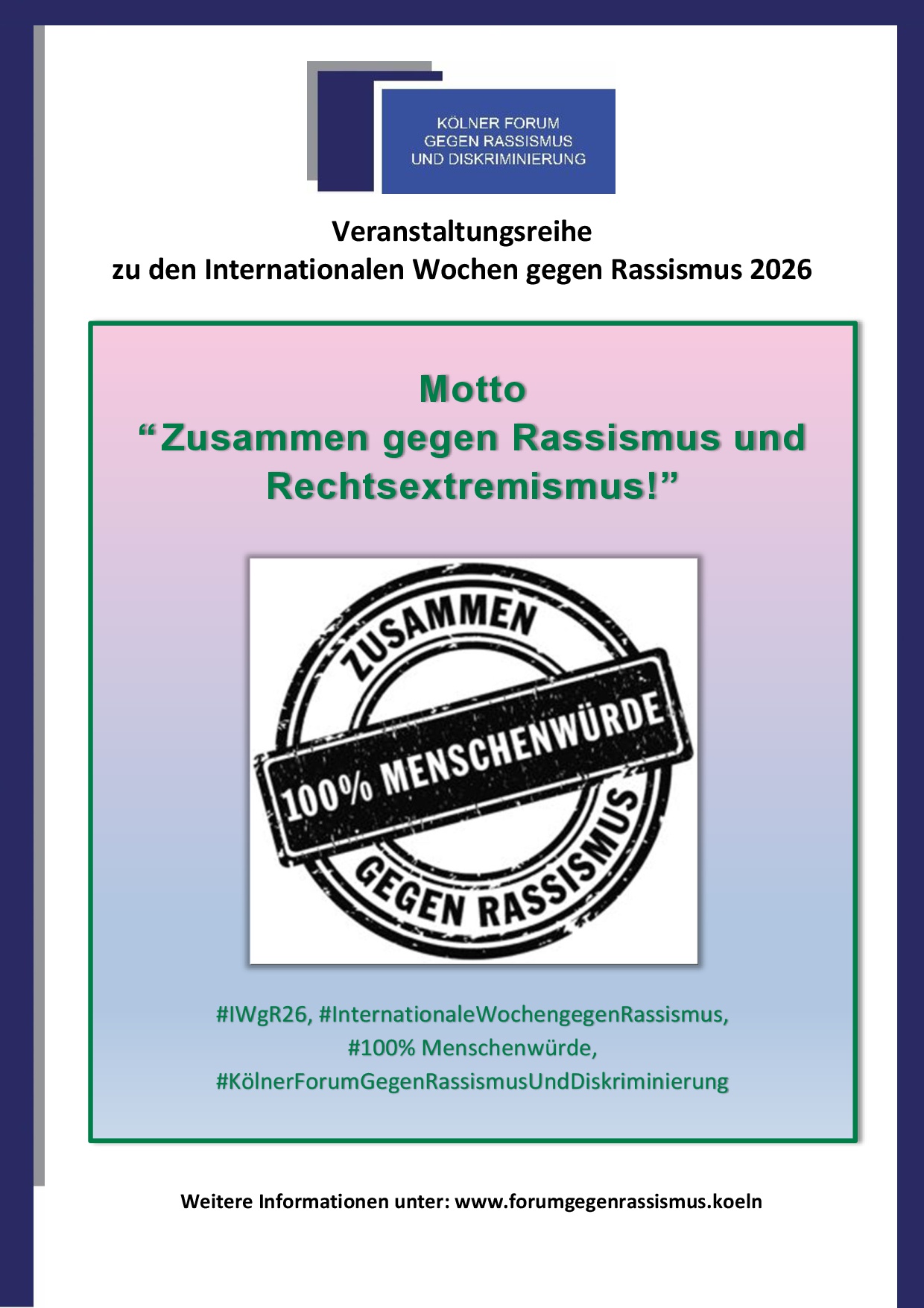 Auch in diesem Jahr veranstaltet das Kölner Forum gegen Rassismus und Diskriminierung und seine Mitgliedsorganisationen anlässlich des Internationalen Tags gegen Rassismus am 21. März eine Vielzahl von Aktionen sowie interessanter Programmpunkte vor Ort in den verschiedenen Stadtteilen Kölns, aber auch online. Mach mit!